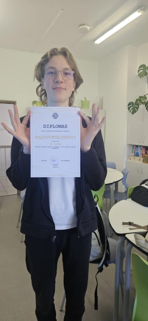 Kovo 19 d. Šiaulių universitetinėje gimnazijoje vyko 8-11 klasių antrų užsienio kalbų rašinio konkursas. Mūsų mokyklos 8a klasės mokinys Naglis Mikelionis (mokyt. Inga Urbonienė) su rašiniu „Eine interessante Geschichte aus meinem Leben” vokiečių kalba savo amžiaus grupėje užėmė II vietą. Sveikiname.
